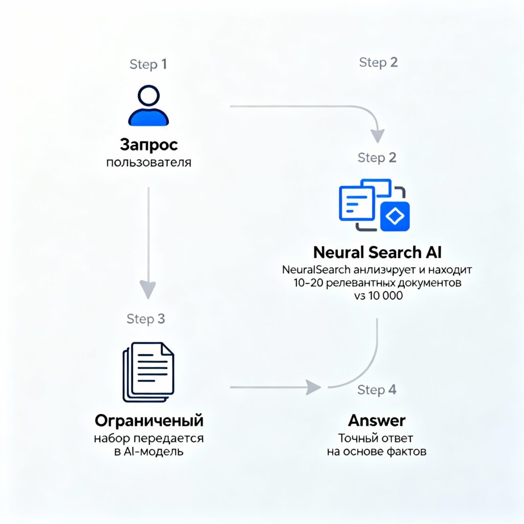 Превратите разрозненные документы в точные ответы. NeuralSearch находит нужную информацию для вас или подготавливает идеальный контекст для искусственного интеллекта, устраняя «шум» и сокращая расходы.
